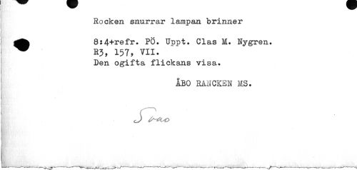 //// Rocken snurrar lampan brinner //// 8:4+refr. PÖ. Upp t. Clas M. Nygren. ~ R3, 157, VII. //// Den ogifta flickans visa. //// <. \ ' //// ÅBO rmcken ms. //// S fr-éOO ////