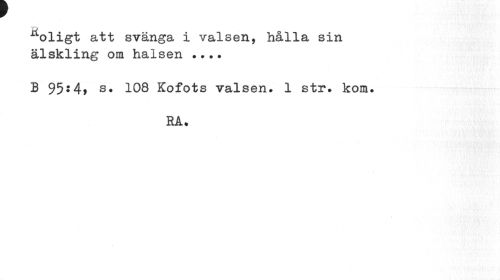 //// ^oligt att svänga i valsen, hålla sin älskling om halsen ... //// B 95:4, s. 108 Kofots valsen. 1 str. kom. //// RA. ////