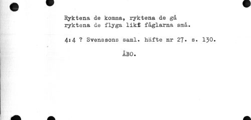 //// ¦ I ^^ //// w //// Ryktena de komma, ryktena de gå ryktena de flyga likf- fåglarna små. //// ¦ //// ¦ //// 4:4 ? Svenssons saml. häfte nr 27* s. 130. //// o //// ÅBO. //// éÉ m ^Hk ////