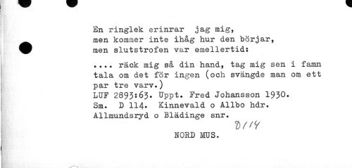 //// En ringlek erinrar jag mig, ^^ men kommer inte ihåg hur den börjar, //// ^P men slutstrofen var emellertid: //// ... räck mig så din hand, tag mig sen i famn tala om det för ingen (och svängde man om ett par tre varv.) //// LUF 2893:63. Uppt. Fred Johansson 1930. Sm. D 114* Kinnevald o Allbo hdr. Allmundsryd o Blädinge snr. //// HORD MUS. ////