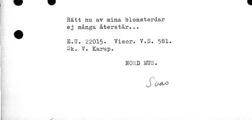 //// Rätt nu av mina blomsterdar ej många återstår... //// E.U. 22015. Visor. V.S. 58I. //// Sk. V. Karup. //// NORD MUS. //// J Lh^> ////