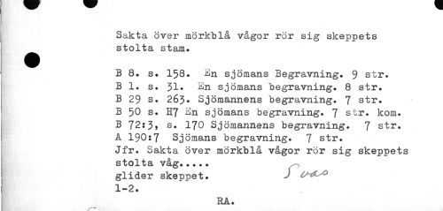 //// Sakta över mörkblå vågor rör sig skeppets ^^ stolta stam» //// B 8. s. 158. En sjömans Begravning. 9 str. Bl. s. 31. En sjömans begravning. 8 str. B 29 s. 263* Sjömannens begravning. 7 str. B 50 s. H7 En sjömans begravning. 7 str. kom. B 72:3, 170 Sjömannens begravning. 7 str. A 190:7 Sjömans begravning. 7 str. Jfr. Sakta över mörkblå vågor ror sig skeppets stolta våg... glider skeppet. J //// 1-2. //// RA. ////