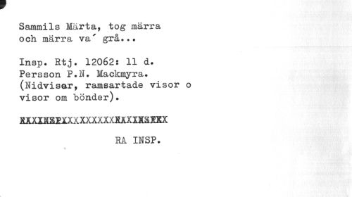 //// Sammils Märta, tog märra och märra va' grå... //// Insp. Rtj. 12062: 11 d. Persson P.N. Mackmyra. (Nidvisar, ramsartade visor o visor om bönder). //// MXIMSEXXXXXXXXXMXIMKEX //// RA INSP. ////