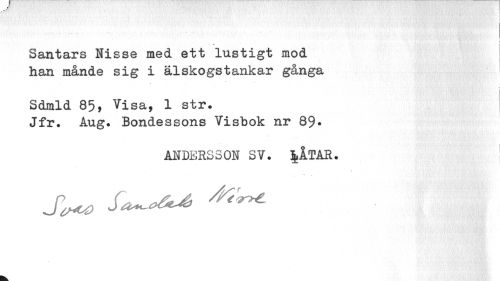 //// I //// Santars Nisse med ett lustigt mod han månde sig i älskogstankar gånga //// i //// Sdmia 85, Visa, 1 str. //// Jfr. Aug. Bondessons Visbok nr 89» //// ANDERSSON SV. |ÅTAR. ////