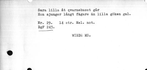 //// Sara lilla åt qvarnehuset går //// Hon sjunger långt fägare än lilla göken gal. //// Nr. 29. 14 str. Mel. not. DgF 243. //// WIEDE MS. ////