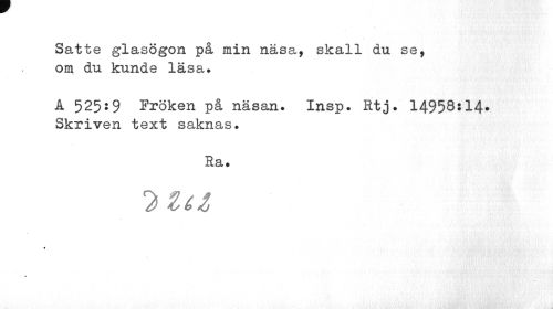 //// Satte glasögon på min näsa, skall du se, om du kunde läsa» //// A 525:9 Fröken på näsan. Insp. Rtj. 1495Q:14* Skriven text saknas. //// Ra* //// 2 za //// % ////