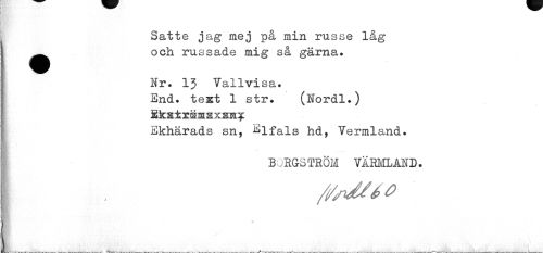 //// Satte jag mej på min russe låg ^^ och rus sade mig så gärna. //// Nr. 13 Vallvisa. //// End. test 1 str. (Nordl.) //// Skaträmsxsh* //// Ekhärads sn, ^lfals hd, Yermland. //// BORGSTRÖM VÄRMLAND. //// ft/rftt* ////