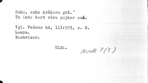 //// Scho, scho kråkera grå.' [ Ta inte bort våra pojkar små. //// Vgl. Vedens hd, 111:503, s. 8. I //// Lampa. j //// Barnvisor. i //// t //// ULMA. 7 ) | //// i ////