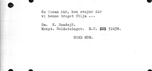 //// Se fanan kär, hon svajar där vi henne troget följa ... //// Sm. N. Sandsjö. //// Mskpt. Soldatsånger. E.U. 32438. //// • • i - .«•.?- ? .m > tf //// NORD MUS. //// t //// * ////