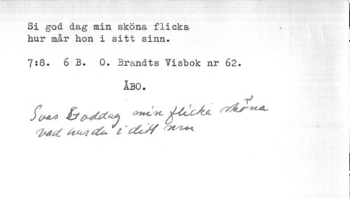 //// Si god dag min sköna flicka hur mår hon i sitt sinn. //// i //// ; i //// 7:8. 6 B. 0. Brandts Visbok nr 62. i //// i //// i //// ÅBO. //// i I i //// i //// i i ////