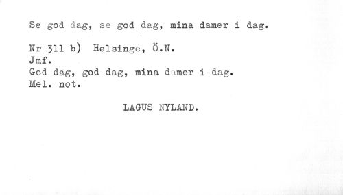 //// Se god dag, se god dag, mina damer i dag. //// i //// Hr 311 b) Helsinge, Ö.N. Jmf. //// God dag, god dag, mina damer i dag. Mel. not. //// LAGUS NYLAND. ////