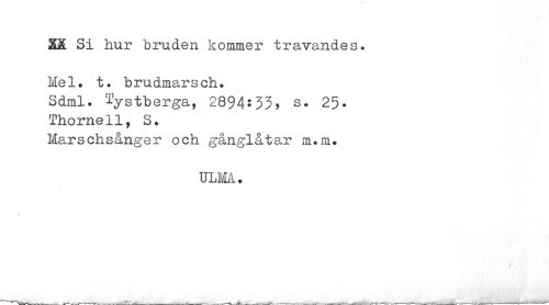 //// XX Si hur bruden kommer travandes. Mel. t. brudmarsch. //// Sdml. Tystberga, 2894:33, s. 25- //// Thornell, S. //// Marschsånger och gånglåtar m.m. //// ULM. //// 4 //// ' fv y. \ \ '. ////