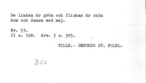 //// ¦ //// Se linden är grön och flickan är skön kom och dansa med mej. //// Nr. 53. //// II a. 348. Arw. 3 s. 305. I //// TILLH.- DENCKER SV. FOLKL. //// d rj ////