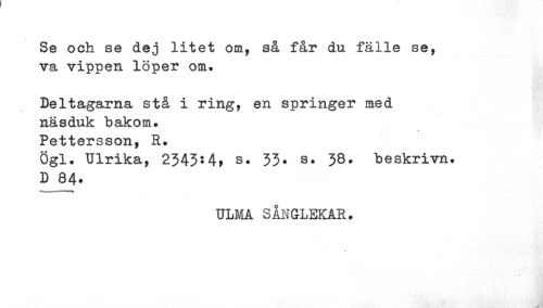 //// Se och se dej litet om, så får du fälle se, va vippen löper om. //// Deltagarna stå i ring, en springer med näsduk bakom. Pettersson, R. //// Ögl. Ulrika, 2343*4* s. 35* s. 38. beskrivn. //// D 84* //// ¦¦i ... //// ULMA SÅNGLEKAR. ////