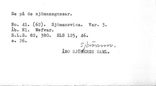 //// ? //// i //// Se på de sjömansgossar. //// No» 41. (62). Sjömansvisa. Var. 3* //// ib. NI. Wefvar. //// S.L.S. 82, 380. SLS 125, 46. //// s # 2.6 + ^ //// ÅBO SJÖBERGS SAML. ////
