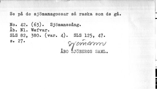 //// Se på de sjömansgossar så raska som de gå. //// : //// i //// No. 42. (63). Sjömanssång. Ib. Hl. Wefvar. //// SLS 82, 380. (var. 4). SLS 125, 47. //// s* 27 • <wc/M#nrrrV \ //// ÅBO SJÖBERGS SAML. //// i ¦ //// i ////