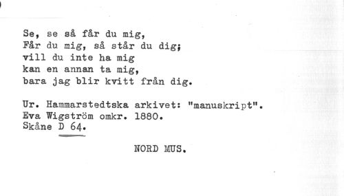 //// Se, se så får du mig, //// Pår du mig, så står du dig; //// vill du inte ha mig //// kan en annan ta mig, //// bara jag blir kvitt från dig. //// Ur. Hammarstedtska arkivet: "manuskript11. Eva Wigström omkr. 1880. //// Skåne D 64. //// NORD MUS. //// * ////