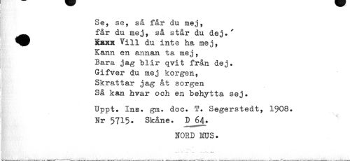 //// Se, se, så får du mej, ^^ får du mej, så står du dej.' //// Xähk Vill du inte ha mej, //// Kann en annan ta mej, //// Bara jag "blir qvit från dej. //// Gifver du mej korgen, //// Skrattar jag åt sorgen //// Så kan hvar och en behytta sej. //// Uppt. Ins. gm. doc. T. Segerstedt, 1908. Nr 5715• Skåne. DJ>4* //// NORD MUS* //// * V* W -n ^ W.- //// iMMUhMi^M . iA ---___M*. »-___---...-r..----- ---*---- -- ...- ----**-----^ ^-- ////