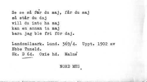 //// t> //// Se se så far du maj, får du maj //// så står du daj //// vill du inte ha maj //// kan en annan ta maj //// bara jag ble fri för daj. //// Landsmålsark. Lund. 369/4* Uppt» 1902 av Ebbe Tuneld. //// Sk. D 64. Oxie hd. Malm* //// NORD MUS ////