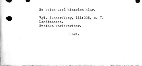 //// Se solen uppå himmelen klar. //// ^^ Ygl. Sunnersberg, 111:226, s. 7* //// Landtmanson. Enstaka kärleksvisor. //// ULMÅ. //// \ ////