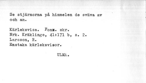 //// Se stjärnorna på himmelen de sväva av o ch an * //// Kärleksvisa* Fonx. skr* //// Nrk. Kräklinge, 41:171 b, s. 2* //// Larsson, R. //// Enstaka kärleksvisor* //// i //// TJLMÅ. //// I ! //// i i ////