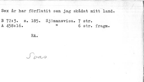 //// ;...- ¦ ¦ ¦ - ...? ¦ tm: £ M //// Sex år har förflutit sen ja g skådat mitt land. //// '.'i //// B 7253. s. 185• Sjömansvisa. 7 str. A 458:16. 6 str. fragm. //// RA. I //// O //// J CH^yO ////