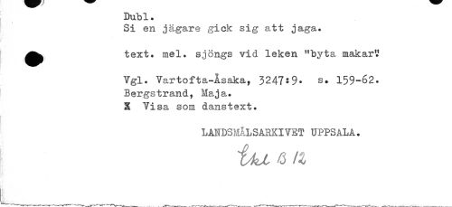 //// Dubl. //// / //// Si en jägare gick sig att jaga. ^^ text. mel. sjöngs vid leken "byta makar? //// Vgl. Vartofta-Asaka, 3247*9- 159-62. //// Bergs trand, Maj a. X Yisa som danstext. //// LANDSMÅL SARKI VE T UPPSALA. //// ija & n ////
