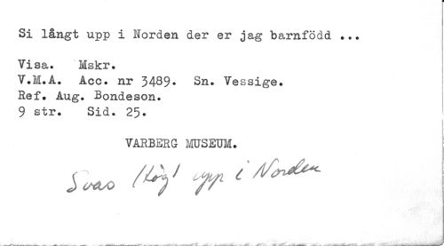 //// Si långt upp i Norden der er jag barnfödd ... Visa. Mskr. //// V.M.A. Acc. nr 3489* Sn. Vessige. Ref. Aug. Bondeson. 9 str. Sid. 25* //// VARBSRG MUSEUM. //// /v ^ ^^ ////