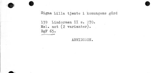 //// Signa Lilla tjente i konungens gård //// 139 Lindormen II s. 270. //// Mel. not (2 varianter). //// DgF 65. //// ARV/I DS SON. ////
