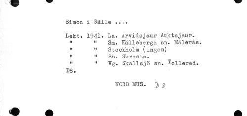 //// Simon i Sälle //// Lekt* 1941* La. Arvidsjaur Auktsjaur. M " Sm. Hälleberga sn. Målerås. //// H 11 Stockholm (ingen) //// M " Sö. Skresta. //// jVj //// " " Vg. Skallsjö sn. iollered. //// D8. //// NORD MUS. g ////