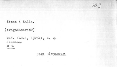 //// ?03 //// i i //// Simon i Sälle. //// (fragmentarisk) //// • - ... ... - * //// Med. Indal, 1926:1, s. 4. 1 //// Jansson. D 8. //// ULMA SÅNGLEKAR. ////