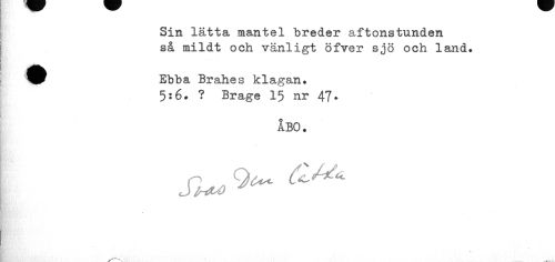 //// Sin lätta mantel breder aftonstunden så mildt och vänligt öfver sjö och land. //// ^^ Ebba Brahes klagan. //// 5:6. ? Brage 15 nr 47* //// ABO, ////