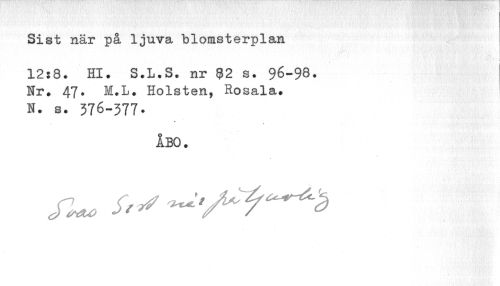 //// Sist när på ljuva blomsterplan //// i //// 12:8. Hl. S.L.S. nr 82 s. 96-98. Nr. 47. M.L. Holsten, Rosala. N. s. 376-377. //// ÅBO. ////