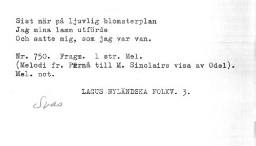 //// Sist när på ljuvlig blomsterplan //// Ja& mina lamm utförde //// Och satte mig, som jag var van. //// Nr. 750. Fragm. 1 str. Mel. //// (Melodi fr. Pärnå till M. Sinclairs visa av Odel). Mel. not. //// / //// LAGUS NYLÄNDSKÅ FOLKV. J. //// 'v-''''1 i ////
