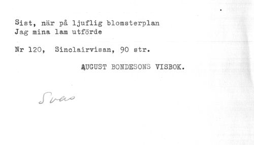 //// Sist, när på ljuflig blomsterplan //// Jag mina lam utförde //// » • • • j //// Nr 120, Sinclairvisan, 90 str. //// 4UGUST BONDESONS VISBOK. ////