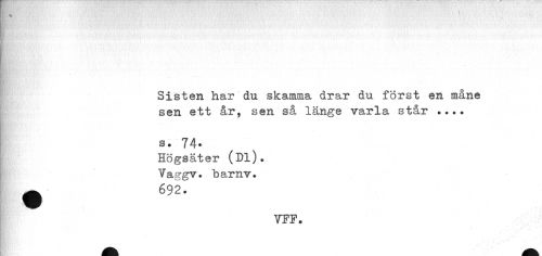 //// « //// Sisten har du skamma drar du först en måne sen ett år, sen så länge varla står ... //// s. 74. //// Högsäter (Dl). Vaggv. härav. ^ 692. //// VFF. ////