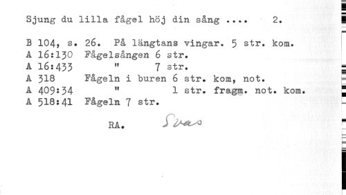 //// Sjung du lilla fågel höj din sång ... 2. 1 //// B 104, s. 26. På längtans vingar. 5 str. kom. A 16:130 Fågelsången 6 str. //// A 16:433 ,f 7 str. g //// A 318 Fågeln i buren 6 str. kom, not. i //// A 409*34 11 1 str. fragm. not. kom. ~ //// A 518:41 Fågeln 7 str. //// HA. i P //// 1 //// C //// I ////