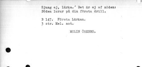 //// Sjung ej, lärka.' Bet är ej af nöden: Döden lurar på din första drill. //// # //// B 147* Första Lärkan. //// 3 str. Mel. not. //// MOLIN ÖREBRO. ////
