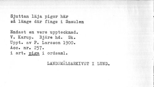 //// f //// ¦'V- ! //// Sjuttan läja pigor här så länge där fings i Smaulen //// Endast en vers upptecknad. ; //// V. Karup. Bjäre hd. Sk. //// Uppt. av P. Larsson 1900. //// Åcc. nr. 257. //// i art. piga i ordsaml. //// „ i //// LANDSMÅLS ARKIVET I LUND. //// 1 //// ¦ //// ¦ //// j //// I ////