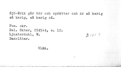 //// Sjö-Erik går här och sprätter och är så karig Sci» karig, så karig så. //// Fon. skr. //// Dal. Säter, 2945*4, s. 12. //// Ljusterdahl, W. 7 //// Danslåtar. //// ULMå. //// . * ////