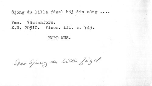 //// Sjöng du lilla fågel höj din sång ... //// • K.* //// V»m. Västanfors. //// E.U. 20310. Visor. III. s. 743. //// HORD MUS. //// fw f ^ ^ ^^ få*' ////
