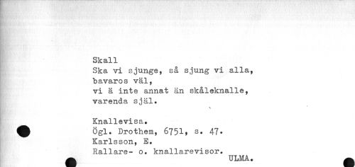 //// Skall //// Ska vi sjunge, så sjung vi alla, bavaros väl, //// vi ä inte annat än skålelcnalle, varenda själ. //// \ //// Knallevisa. ^^ Ögl. Drothem, 6751, 47* //// Karlsson, E. //// Rallare- o. knallarevisor. a ULMA. ^ ////