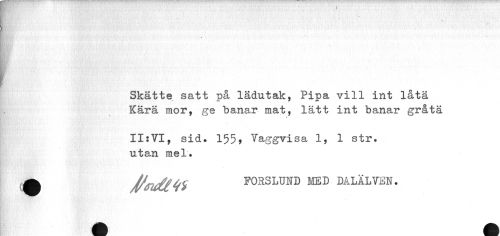 //// '''ii* i //// ml //// ¦ //// Skatte satt på lädutak, Pipa vill int låta //// Kärä mor, ge banar mat, lätt int banar gråta //// / //// II:VI, sid» 155, Vaggvisa 1, 1 str. utan mel. //// ^ FORS LUND MED DALÄLVEN. ////