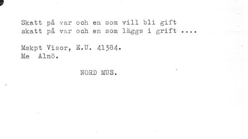 //// « //// Skatt på var och en som vill bli gift skatt på var och en som läggs i grift ... //// Mskpt Visor, E.U. 41?84. Me Aino. //// NORD MUS. ////