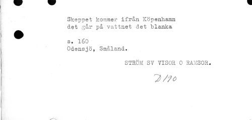 //// Skeppet kommer ifrån Köpenhamn //// det går på vattnet det blanka //// s. 160 //// Odensjö, Småland. //// STRÖM SV VISOR 0 RAMSOR. //// h/fö ////