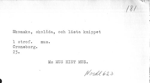 //// /<?/ 1 //// I //// ^ c //// Skomaka, skolåda, och lästa knippet //// 1 strof. mus. Croneborg. //// 23. //// Ms MUS HIST MS. //// p //// C //// \ ////