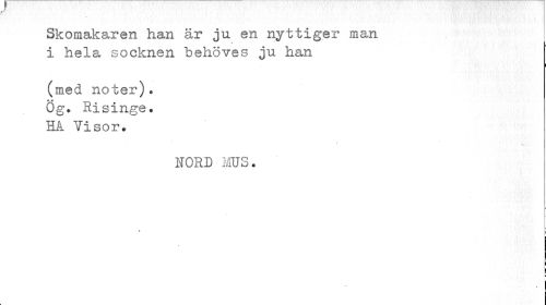 //// Skomakaren han är ju en nyttiger man i hela socknen behöves ju han //// (med noter). Og. Risinge. Kk Visor. //// NORD MUS. //// ? - //// i //// ! ¦ ////