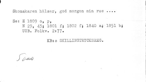 //// Skomakaren hälsar, god morgon min ros ... //// i //// Se: E 1809 o, p, //// N 29, 43} 1801 ff 1802 f; 1840 a; 1851 b; I //// UTJB. Folkv. 2:77. j //// I //// KB:s SKILLINGTRYCKSREG. //// i //// \ //// \ 5 ////