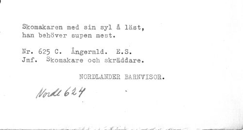 //// Skomakaren med sin syl å läst, han behöver supen mest. //// Hr. 625 C. Angermld. E.S. //// Jmf. Skomakare och skräddare. //// NORDLANDER BARNVISOR. //// fa/eéW //// __^___ ... ___ ___• . A ' J___-__... : ___ . , ---^^ • ___ . _ ////