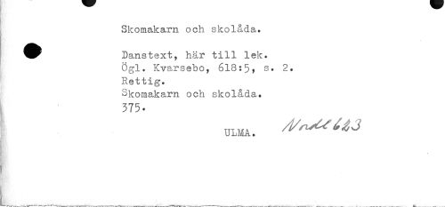 //// Skomakarn och skolåda» //// ^^ Danstext, här till lek. //// Ögl. Kvarsebo, 618:5? s. 2. Rettig. //// Skomaka,rn och skolåda. //// 375 • ////